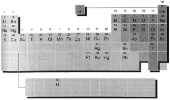 Рис. 5.10.Современная форма периодической таблицы. Я показал только некоторые элементы, т.е. которые, насколько я могу судить, достаточно хорошо известны, или стоящие во главе своих групп (K это калий, Na – натрий, Fe – железо, Pb – свинец, Sn – олово: химики время от времени залезают в латынь). Пронумерованные вертикальные колонки называются группами, а горизонтальные ряды назывался периодами. Водород (несколько идиосинкразически, но, на мой взгляд, разумно) поставлен во главе всей таблицы и не приписан ни к какой группе. Светло-серым отмечены металлы, темно-серым неметаллы, а просто серым – металлоиды, элементы, по своим свойствам застрявшие между металлами и неметаллами. Двухрядный блок элементов внизу таблицы следовало бы вставить в указанное место, но это сделало бы таблицу слишком нескладной. Таблица постепенно растет, по мере того как создаются новые элементы.