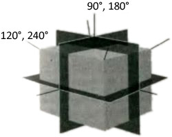 Рис. 6.1.Некоторые из преобразований симметрии для куба. Куб выглядит неизмененным, когда мы вращаем его на 90° или 180° вокруг осей, перпендикулярных каждой грани, и на 120° или 240° вокруг осей, проходящих через противоположные углы. Он также выглядит неизмененным при отражении относительно любой из изображенных здесь плоскостей. Есть еще два преобразования симметрии: инверсия относительно центра куба и тождественное преобразование (ничегонеделание).