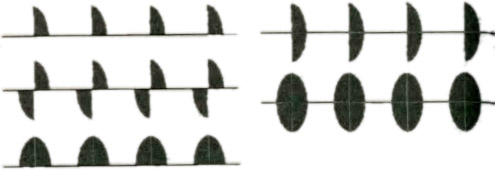 Рис. 6.2.Эти формы символизируют пять узоров фриза, допустимых в одномерном случае. Существуют различные мотивы, поскольку квадрант, показанный здесь в различных ориентациях, может быть заменен любым рисунком, но эти пять узоров исчерпывают все возможные регулярные фризы.