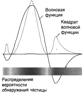 Волновые функции не являются просто математическими формулами, не имеющими смысла: мы можем проследить, как современная интерпретация их физического смысла восходит к предположению, сделанному Борном. Борн заметил, что в классических (волновых) терминах интенсивность света пропорциональна квадрату амплитуды (меры отличия от нуля) электромагнитной волны, в то время как в квантовых (фотонных) терминах эта интенсивность пропорциональна вероятности обнаружения фотона в данной области пространства. Если амплитуда световой волны удваивается, его интенсивность учетверяется (луч становится в четыре раза ярче), и мы с учетверенной вероятностью обнаружим фотон в этой области пространства. Затем он предположил, что естественно распространить это соотношение на волновые функции и интерпретировать квадрат волновой функции частицы в некоторой точке, как дающий вероятность обнаружения в ней этой частицы. Так, если волновая функция в одном месте имеет вдвое большую амплитуду, чем в другом, то шансов обнаружить частицу в первом положении в четыре раза больше, чем в последнем. Мы можем заключить, что там, где квадрат волновой функции велик, имеется высокая вероятность обнаружения частицы, а там, где он мал, вероятность обнаружения частицы низка (рис. 7.4). Такая интерпретация, как можно видеть, означает, что области, где волновая функция является отрицательной величиной, – соответствующие впадине волны на воде – имеют тот же смысл, что и области, где она положительна, поскольку мы пользуемся квадратом волновой функции, и отрицательные области тоже становятся положительными.