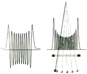 Наконец, предположим, что мы не знаем точно энергию шарика (возможно, дрожат наши руки, держащие проволоку, или по шарику колошматят молекулы воздуха). В этом случае волновая функция не будет в точности похожа на изображенную нами, а будет суммой большого числа подобных волновых функций с несколько отличающимися формами. Результирующая суперпозиция будет волновым пакетом, похожим на изображенный на рис. 7.7. Как мы уже видели, каждая индивидуальная волновая функция осциллирует как во времени, так и в пространстве, поэтому форма, которую они образуют, складываясь вместе, меняется, ибо в один момент в одном месте гребни могут наложиться друг на друга, но затем гребень превращается во впадину, и волновой пакет принимает другую форму. Когда мы исследуем эту сумму, оказывается, что область конструктивной интерференции, создающей волновой пакет, перемещается слева направо. То есть шарик ускоряется слева направо, в точности как мы знаем из классической физики. Поэтому, когда вы наблюдаете повседневные объекты в их знакомых движениях – прыгающие мячи, летающие самолеты, гуляющих людей, – созерцайте умственным взором мысль о том, что вы наблюдаете волновые пакеты и что под их поверхностью пульсирует суперпозиция волн.