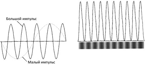 Рис. 7.9.Представление зависимости волновых функций от времени. Волновые функции осциллируют во времени со скоростью, зависящей от их энергии. Мы попытались показать, как осциллируют две волновые функции, изображенные на рис. 7.6: волновая функция с большой кинетической энергией (справа) осциллирует быстрее, чем волновая функция с малой кинетической энергией (слева).