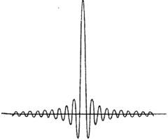 Рис. 7.7.Волновой пакет, образованный суперпозицией тридцати волновых функций, подобных изображенным на предыдущей иллюстрации, но с различными длинами волн. Хотя частица с большой вероятностью будет обнаружена в довольно четко определенной области пространства, мы ничего не можем сказать о том, какое из тридцати значений импульса будет преобладать. В дальнейшем обсуждении мы увидим, что этот волновой пакет движется подобно классической частице.