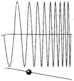 Где скорее всего мы найдем частицу? Давайте представим себе шарик, носящийся взад и вперед по длинной проволоке, поворачивая обратно на каждом ее конце, и рассмотрим его движение как случайное. Из-за того, что шарик движется с постоянной скоростью, в соответствии с классической физикой шансы найти его в любой точке проволоки равны. Квантовая механика дает иное предсказание. Чтобы предсказать, где будет обнаружен шарик, мы воспользуемся предложением Борна: вычислим квадрат волновой функции в каждой позиции и интерпретируем результат как вероятность обнаружить частицу в этой позиции. Как можно видеть из иллюстрации, частица с наибольшей вероятностью будет обнаруживаться в серии одинаковых областей, регулярно расположенных на проволоке, а не будет распределена совершенно однородно.