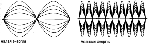 Теперь, вот удивительная черта. Предположим, что мы оттягиваем груз и отпускаем его. Он будет раскачиваться в некотором диапазоне энергий, возможно, из-за толчков молекул воздуха или неровности подставки. Поэтому его реальная волновая функция будет волновым пакетом, сформированным суперпозицией большого числа функций, подобных изображенным на иллюстрации. Волновой пакет прокатывается из стороны в сторону, двигаясь быстрее, когда маятник вертикален, и медленнее на краях размаха качаний, так же как классический маятник. Более того, и это удивительно, частота качаний – число качаний груза из стороны в сторону за секунду – в точности равна параметру частоты, появляющемуся в выражении для интервалов между квантовыми энергетическими уровнями. Поэтому, когда вы наблюдаете качание маятника, вы не только видите движение волнового пакета, вы видите также, наблюдая частоту, прямое отображение в высшей степени близко расположенных энергетических уровней. Другими словами вы непосредственно наблюдаете квантование. Маятник является мощным усилителем для интервалов между его квантовыми энергетическими уровнями, и когда вы наблюдаете однометровый маятник, качающийся туда-сюда, вы непосредственно наблюдаете энергетический интервал в триста триллионно-триллионно-триллионных джоуля. Я думаю, что это удивительно.
