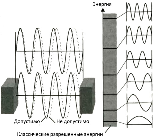 Рис. 7.10.Когда положение частицы ограничено определенной областью пространства, допустимы лишь те волновые функции (и соответствующие им энергии), которые «укладываются» в контейнер. Слева мы видим прямое изображение и изображение двух волновых функций: одна укладывается в контейнер и допустима, другая (состоящая из точек) не укладывается и не допустима. Справа мы видим результаты для энергии: серый столбик показывает классические разрешенные энергии, а горизонтальные линии показывают первые шесть квантовых, разрешенных энергетических уровней. Соответствующие волновые функции показаны правее.