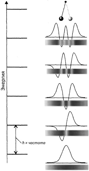 Квантование интересным способом возникает в случае маятника, создавая один необычный аспект. Сначала рассмотрим волновую функцию для положения качающегося груза с точно определенной энергией (так, что он находится в определенном квантовом состоянии). Потенциальная энергия груза возрастает, когда груз отклоняется в какую-либо сторону, поэтому его кинетическая энергия падает, чтобы сохранить полную энергию постоянной, и с классической точки зрения мы можем ожидать, что волновая функция имеет наибольшую амплитуду в крайних точках качания, где груз задерживается дольше. Мы уже видели одну такую волновую функцию (рис. 7.5). Так же как для шарика между зажимами, допустимыми волновыми функциями будут те, которые согласуются с рядом величин, допускаемых качанием от одной поворотной точки до другой. Поскольку только некоторые из возможных волновых функций ведут себя подходящим образом, и каждая волновая функция соответствует определенной энергии, отсюда следует, что только некоторые энергии являются допустимыми. Оказывается, что эти допустимые энергии образуют однородную лестницу величин с разделительным интервалом между «ступеньками», который мы запишем как ħ × частота, где ħ– постоянная Планка, а частота (о которой мы скоро скажем больше) является параметром, обратно пропорциональным корню квадратному из длины маятника. Для маятника длиной 1 м на поверхности Земли вычисления дают частотув 0,5 Гц, поэтому интервал между допустимыми энергетическими уровнями представляет собой очень маленькую и совершенно не регистрируемую величину в триста триллионно-триллионно-триллионных джоуля (3×10 − 34Дж), но он существует. Некоторые из этих энергий и соответствующие им волновые функции изображены на рис. 7.11.