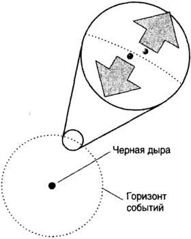 Рис. 8.14.Наглядная иллюстрация возникновения излучения Хоукинга, из-за которого черные дыры теряют массу и съеживаются. Черная дыра окружена горизонтом на расстоянии радиуса Шварцшильда, из-за которого ничто, даже свет, не может пробиться наружу. Однако, если на горизонте образуется пара из частицы и античастицы (как, например, электрон и позитрон), античастица может оказаться внутри горизонта, а частица может образоваться снаружи от него. Это дает возможность частице покинуть черную дыру и тем уменьшить ее массу. Оказывается, что интенсивность этого излучения имеет характеристики излучения черного тела с температурой, обратно пропорциональной массе черной дыры.