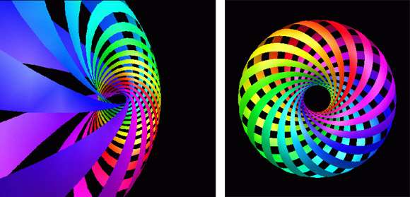Рис. 9.1.Некоторое отдаленное представление об объектах в гиперпространстве может быть получено с помощью графических образов и анимаций. Здесь изображены два кадра анимации, изображающей вращение плоского тора в четырех измерениях, спроектированное в три измерения и затем представленное в двух.
