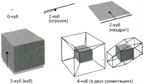 Ноль-мерный куб (0-куб) – это точка. Представьте себе 0-куб как карандашную точку, тогда одномерный куб (1-куб) является линией, которую карандаш рисует, когда его двигают по прямой (рис. 9.2). Двумерный куб (2-куб) является плоской фигурой, порожденной протаскиванием 1-куба в новом направлении, лежащем перпендикулярно первому. Все это легко воспринять с помощью компаса нашего воображения, так же как и воображения смышленого муравья, и легко проделать на листе двумерной бумаги. Трехмерный куб (3-куб), заурядный повседневный куб, порождается протаскиванием плоского 2-куба в направлении, перпендикулярном его плоскости. С тем, чтобы вообразить этот шаг, проблем не возникает, хотя муравей был бы озадачен, поскольку ему не дано понять, как может существовать третье перпендикулярное направление. Не возникает проблем и с представлением 3-куба на 2-странице, обычном листе бумаги, поскольку мы теперь так хорошо знакомы с двумерными представлениями в искусстве, что расшифровываем эти представления без труда.