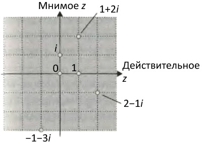Рис. 10.5.Комплексное число является двухкомпонентным числом и как таковое может быть представлено точкой на плоскости. Например, комплексное число 2 −1 iобозначается точкой с координатами 2 единицы по горизонтальной оси и 1 единица вниз по вертикальной оси. Операции с комплексными числами есть просто операции с двухкомпонентными объектами.
