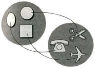 Рис. 10.7.Множество объектов имеет тот же самый размер, что и другое множество, если элементы этих множеств могут быть поставлены во взаимно однозначное соответствие. Эти два множества имеют один и тот же размер: если убрать самолетик, они будут иметь разные размеры.