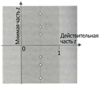 Рис. 10.9.Известно, что все решения уравнения 1 + 1/2 z+ 1/3 z+ 1/4 z+ … = 0, где z– комплексное число, лежат в окрашенной полосе между 0 и 1. Одна из форм гипотезы Римана утверждает, что все решения этого уравнения на самом деле лежат на центральной линии полосы (как обозначено маленькими кружками), на которой действительная часть равна 1/2 в каждом случае.