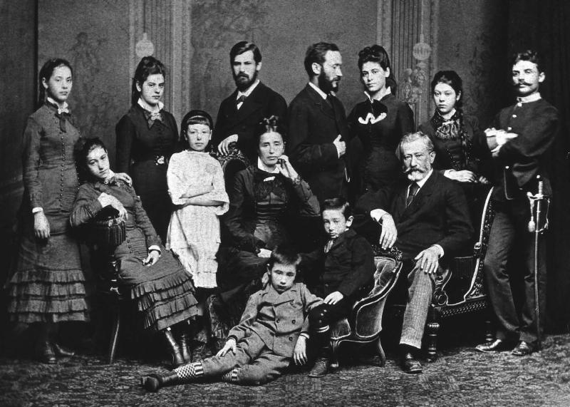 6. Амалия и Якоб Фрейд с детьми. Двадцатилетний Зигмунд в центре, смотрит в камеру, сводный брат Эммануил повернулся к нему спиной. В этом же ряду (слева направо) сестры Фрейда Паулина, Анна, Роза и Мария, а также кузен Амалии Симон Натансон. Ниже сидят сестра Фрейда Адольфина и их родители. Мальчик в кресле – вероятно, брат Фрейда Александр. Другие дети неизвестны. Около 1876 года.