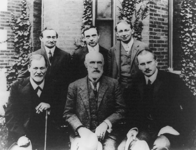 19. Грэнвилл Стэнли Холл, Зигмунд Фрейд, Карл Густав Юнг (сидят), Абрахам А. Брилл, Эрнест Джонс и Шандор Ференци (стоят) в Университете Кларка. Вустер, Массачусетс, США. Сентябрь 1909 года.