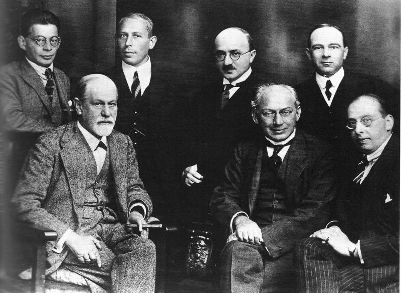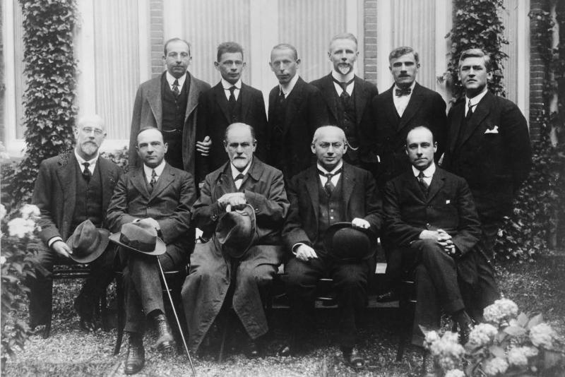 23. Фрейд (сидит в центре), Эрнест Джонс (второй слева), Шандор Ференци (второй справа) и Карл Абрахам (стоит третий слева) на конгрессе в Гааге. 1920 год.