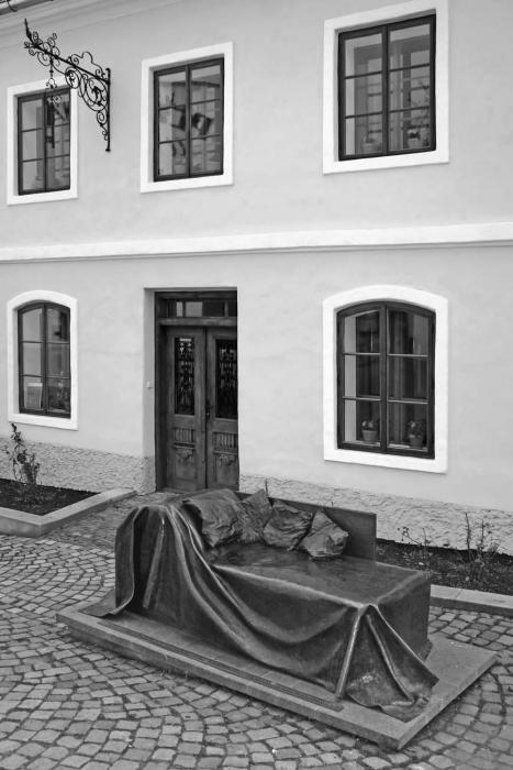 37. Подаренная Фрейду около 1890 года знаменитая психоаналитическая кушетка, отлитая в бронзе, перед домом Фрейдов во Фрайберге (ныне Музей Фрейда в Пршиборе).