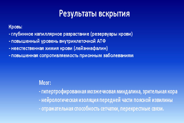 Тканевые уровни АТФ-азы были увеличены; АТФ – химическая батарейка, заряжающая клетки, и это объясняет аномальную силу и выносливость, которую Донни демонстрировал в свои последние дни.