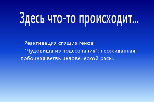Что же, черт возьми, здесь произошло? Мы предположили, что генная терапия каким-то образом запустила так называемую «мусорную ДНК» Донни, активировав набор древних генов, которые не проявляли себя в течение нескольких сотен тысяч лет. Но это были не случайные, произвольные дефекты: это был полный набор взаимодействующих древних признаков, систематически влияющих на все, от пищеварительного тракта до центральной нервной системы. Все вы знакомы со старым заезженным клише о «внутреннем звере» или «чудовищах из подсознания». Судя по всему, психоаналитики могли быть правы. Донни находился в процессе превращения в совершенно иной организм, который вполне мог быть даже другим подвидом.