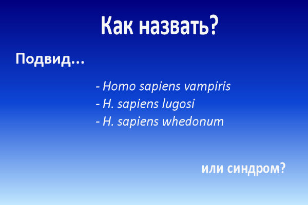 Воспроизводство: согласно классической мифологии, вампиры размножались, превращая в вампиров своих жертв. Ревизионисты и авторы романов ужасов представляли вампиризм как своего рода вирусную инфекцию, венерическое заболевание, передающееся из слюны в кровь. С биологической точки зрения у этой идеи есть недостатки: если вы создаете другого вампира каждый раз, когда едите, очень скоро все ваши жертвы превратятся в вампиров, а те быстро проголодаются. Однако сама идея не так абсурдна, как кажется на первый взгляд. Горизонтальный перенос генов в природе встречается; некоторые микробы действуют как переносчики ДНК других видов, передавая их от одного хозяина к другому, а в данном случае хищник и его жертва обладают многими общими генами. Возможно, единственное, что нужно передать, это некий катализатор, который их активирует. Однако более вероятно, что вампиры и люди никогда не достигали полной репродуктивной изоляции; нет причин, по которой их скрещивание не могло давать потомков-вампиров, особенно если важнейшие вампирские гены были гетерозиготными доминантами. Это один из основных аргументов группы, которая придерживается точки зрения на вампиров как на синдром, а не на подвид, и считает, что если кто-то ходит, как утка, крякает, как утка, и занимается сексом с утками, это и есть утка, даже если она выглядит, как гриф-индейка.