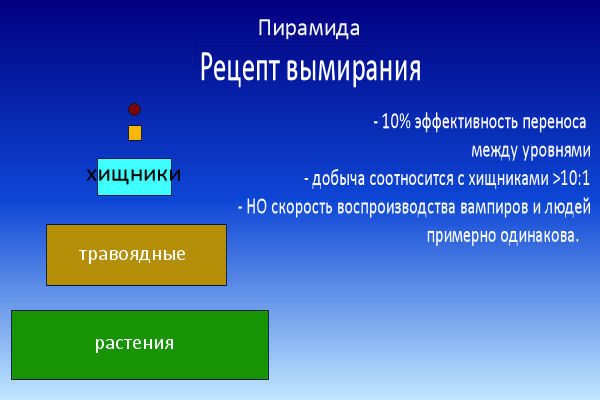 Здесь возникает еще одна проблема вампиров, связанная с их добычей: соотношение дичи и хищников. Практически во всех случаях, когда одни виды едят другие, добыча по меньшей мере на один порядок многочисленнее хищника и быстрее размножается. Причины этого очевидны: перенос пищевой энергии между трофическими уровнями очень неэффективен. Коровы должны съесть десять килограмм травы, чтобы сделать один килограмм коровы; требуется десять килограмм коровы, чтобы сделать один килограмм человека; и конечно, требуется десять килограмм человека, чтобы сделать один килограмм вампира. Поэтому на любом уровне надо быть чертовски уверенным в том, что уровень ниже воспроизводится по отношению к вам по меньшей мере как десять к одному, или вы уничтожите собственный источник пищи.