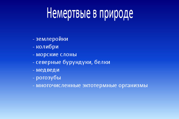 Что тут можно сделать, так это снизить свою активность. Ранее я упоминал, что в крови Донни были обнаружены повышенные уровни лейэнкефалина, пептида, связанного с гибернацией. Выясняется, что вампиры сохраняют энергию – и свои источники пищи, – с помощью продолжительных периодов спячки. Как вам известно, анабиоз – достаточно распространенное явление даже среди таких высших животных, как птицы и млекопитающие. Землеройки и колибри имеют очень высокий уровень метаболизма и умерли бы от голода, если бы не могли отключаться вечером. Морские слоны увеличивают время задержки дыхания, оказавшись на морском дне, и входят в глубокое оцепенение, поджидая свою добычу. Медведи и бурундуки засыпают на зимний период бескормицы, а рогозуб может свернуться и умереть на четыре – семь лет, до возвращения дождей.