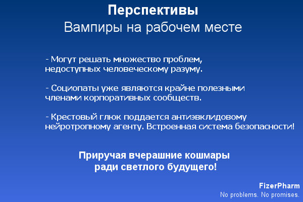 Но даже здесь вампиры оказываются нашими главными союзниками, потому что они обладают собственной встроенной гарантией защиты! Крестовый глюк однажды уже уничтожил их, а сегодня в нашей городской среде, полной прямых углов, он убьет их еще быстрее. На самом деле единственный способ, которым мы смогли обезопасить их от судорожного припадка в первую же секунду – и здесь я немного приоткрываю коммерческую тайну, поскольку мы уже запатентовали молекулу, – это строгий режим получения антиэвклидовых нейротропов. Мы разработали лекарство, которое подавляет судорожные припадки от крестового глюка, лекарство, позволяющее вампирам чувствовать себя нормально в городской среде; а без этого лекарства они умрут. Мы держим их на очень коротком и прочном поводке, и они вполне умны, чтобы понимать: служение нашим интересам входит в насущные интересы их самих.