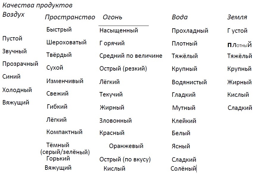 Отмечая наличие определенных качеств в различных продуктах, вы научитесь распознавать пишу, наилучшим образом подходящую для вашего типа кожи. Приведём несколько примеров. Латук обладает прозрачностью, а значит, в нём присутствует элемент пространства, от природы ясный и чистый. Если в вашей конституции доминирует Вата (пространство + воздух), то латук (ИЛИ любой другой овощ, блюдо и т.д. с этим качеством) не является для вас полезным продуктом. Представителям Питта-типа следует избегать большинства красных и оранжевых продуктов, в которых от природы силён элемент огня. А людям Капха-типа необходимо ограничить потребление клейкой, тяжёлой пищи, такой как варёный рис и макароны, в которых от природы преобладают элементы воды и земли. В сладкой густой пище (например, в овсянке с изюмом) много земли. Много земли и в холодном, сладком мороженом, и в жирной сметане. Однако крекеры и холодная каша – сухие и шероховатые по структуре, а следовательно, в них много воздуха. Следующее ниже описание основных пищевых категорий также поможет вам распознавать качества продуктов в зависимости от присутствия в них элементов.
