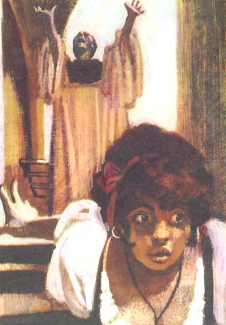 (Становится на колени перед образом мадонны.) Пресвятая богородица! Спаси меня!.. Я... я... Да, это она, те же черты... Ее черные глаза!.. О Марикита! (Протягивает руки к образу и в ужасе отшатывается.) Господи! Глаза ее мечут молнии. Ты осуждаешь меня за кощунство!.. Решусь ли... Нет, ты не увидишь моего греха. Уйди! (Поворачивает образ ликом к стене.)