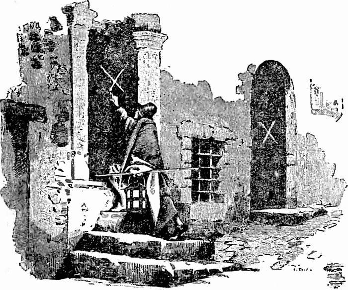 Немного далее он заметил дурно одетого человека, который останавливался перед некоторыми домами и отмечал двери, ставя мелом кресты.