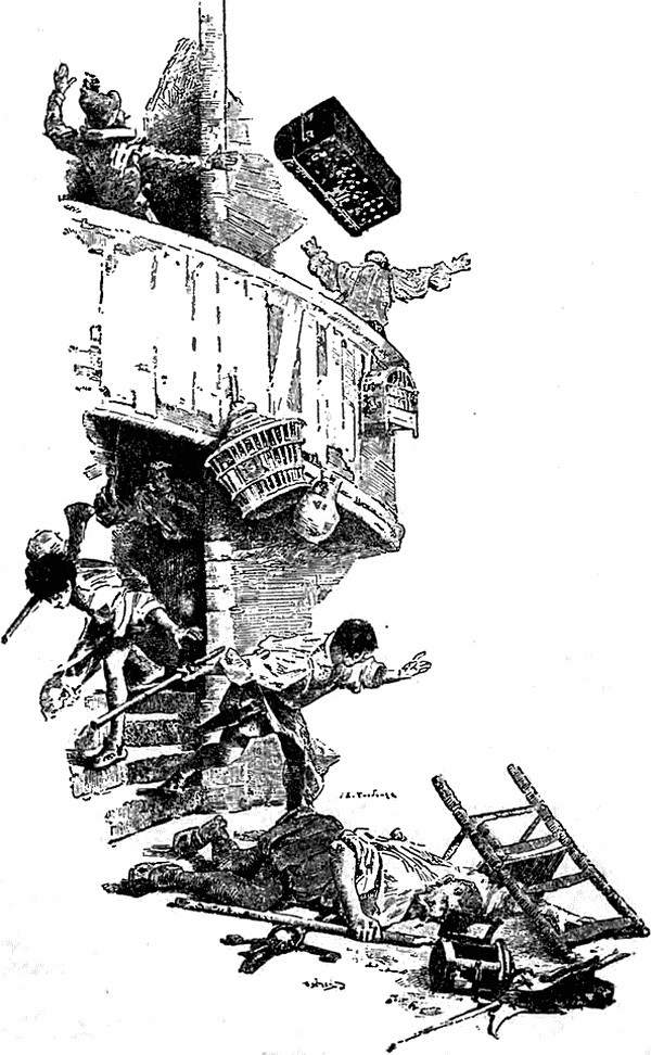 Первым шествовал трактирщик со старой алебардой в руках. Три поваренка, вооруженные вертелами и скалками, следовали за ним. Сосед корчмаря, держа в руках ржавую пищаль, образовывал собою войсковой арьергард. Ни та, ни другая сторона не ждали такой быстрой встречи. Всего пять-шесть ступенек разделяли вражеские лагери.