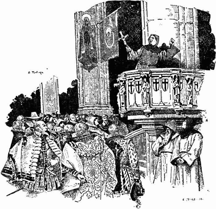 С этими словами он вышел из ризницы и мгновенно оказался на кафедре. В церкви воцарилось глубокое молчание. Проповедник обвел глазами толпу, теснившуюся около кафедры, и обвел всех глазами, словно отыскивая того, с кем он бился об заклад, устремил свой взгляд, найдя своего спорщика, прямо на него, нахмурился, подбоченился и яростным голосом закричал: