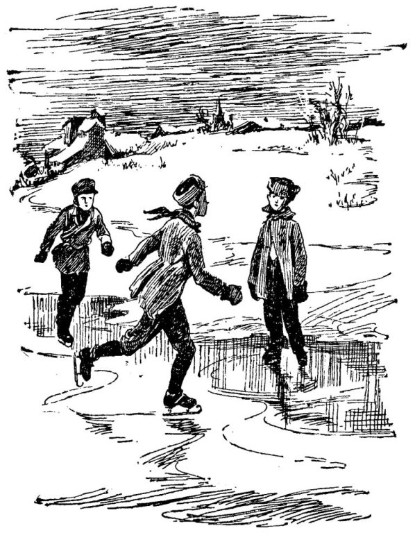Привязал Стяпукас к правой ноге конек, к левому башмаку прикрепил гвоздь, для того чтобы лучше отталкиваться, поднял левую ногу и оглянуться не успел, как уже очутился у речки. Хорошо было здесь, за ветром, такой широкий ледяной простор – катайся сколько хочешь! Вначале Стяпукас решил только прокатиться у берега, но потом попробовал и вдоль и поперек, а лед даже не потрескивал. Прошло некоторое время, и тут же вдруг оказались и Старостины дети, прикатившие вниз по реке со стороны мельничной плотины. И так чудесно было кататься, что Стяпукас забыл о предупреждении матери. Да тут и посмотреть было на что: старший сын старосты, Прунце, нацепил себе на обе ноги по настоящему стальному коньку, без деревяшек и веревок, с ремешками. Таких Стяпукас еще никогда не видывал. Раскорячившись, словно жук-плавунец на воде, Прунце носился так быстро, что никто за ним не мог угнаться. Он катался и на одной ноге и на обеих ногах одновременно, не подымая их даже, только легким движением колена изменяя направление бега. Глядя на разинувшего рот Стяпукаса, Прунце закричал: