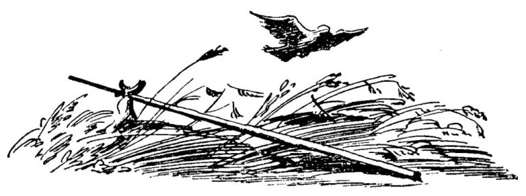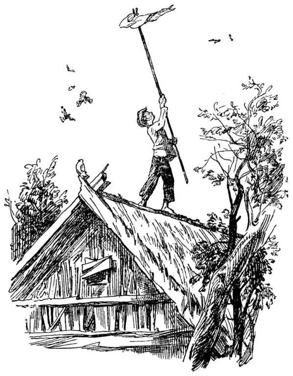 На лоб мальчика набежали морщинки. Губы его шевелились. Он шептал какие-то, ему одному понятные слова. Вдруг Турман прислушался. Потом, отставив кувшин, он вскочил и, улыбаясь, вытащил из-под навеса длинную жердь с привязанной к ней тряпкой. Он, как кошка, вскарабкался на крышу по углу сруба. Над его светловолосой головой закружилась белая тряпка, похожая на летящую по кругу птицу.