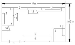 План комнаты Виктора Николаевича: 1 – дверь; 2 – окно с форточкой, шторой и подоконником; 3 – окно в глухую стену, плотно заставленное большим буфетом; 4 – большой высокий буфет; 5 – кровать, превращенная в тахту; 6 – ковер над кроватью; 7 – обеденный стол под клеенкой, служивший Виктору Николаевичу рабочим столом, здесь же он ел, когда был один; 8 – выдвижной столик-тумбочка, его использовали для приема гостей, перемещая между кроватью-тахтой и буфетом; 9 – две книжные полки; 10, 11, 12 – стулья.
