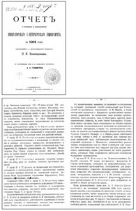 Титульный лист «Годового отчета Императорского Санкт-Петербургского университета за 1904 год» С. 59 отчета, на которой упомянуто имя студента В. Сороки и тема его экспериментальной научной работы