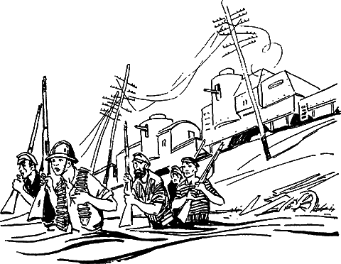 Яростная перестрелка. Пулеметные очереди. Видно, как на противоположном берегу Кэби белые выбираются из окопов и карабкаются вверх по склону.