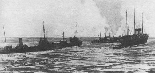 Моряки сумели договориться о буксировке с экипажем заградителя 'Лена'. В пути обнаружилась течь через поврежденный льдами пластырь. Воду откачивали вручную, но справиться с ее поступлением могли, лишь накренив корабль и заделав пробоину цементом. 'Восьмеро спасли эсминец', – так писал об этом героическом подвиге участник плавания П. Стасевич. Разные судьбы выпали кораблям. Лишившись главных баз, они в кампанию 1918 г. оказались рассредоточенными по гаваням Кронштадта и в Неве.
