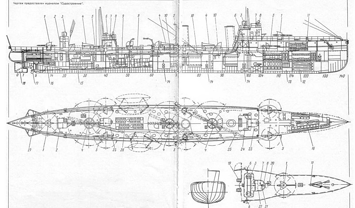 (Продольный разрез, планы верхней палубы, полубака и теоретический чертеж) 1-75-мм орудие. 2-рубка радиотелеграфа, 3-прожектор, 4-минный аппарат, 5-57-мм пушка, 6-пулемет, 7-штурвал. 8-компас. 9– машинное отделение, 10– котельное отделение, 11-шпиль, 12– помещение запасных торпед, 13– погреб боезапаса, 14– водонепроницаемая крышка угольной ямы. 15-офицерские помещения. 16– помещения команды, 17-винт, 18-руль, 19-трап, 20-люк ручной подачи снарядов, 21– машинный телеграф, 22-боевая рубка, 23-ходовая рубка. 24-камбуз, 25– горловина угольной ямы. 26-саетовой люк машинного отделения, 27-ограждение гребного винта.