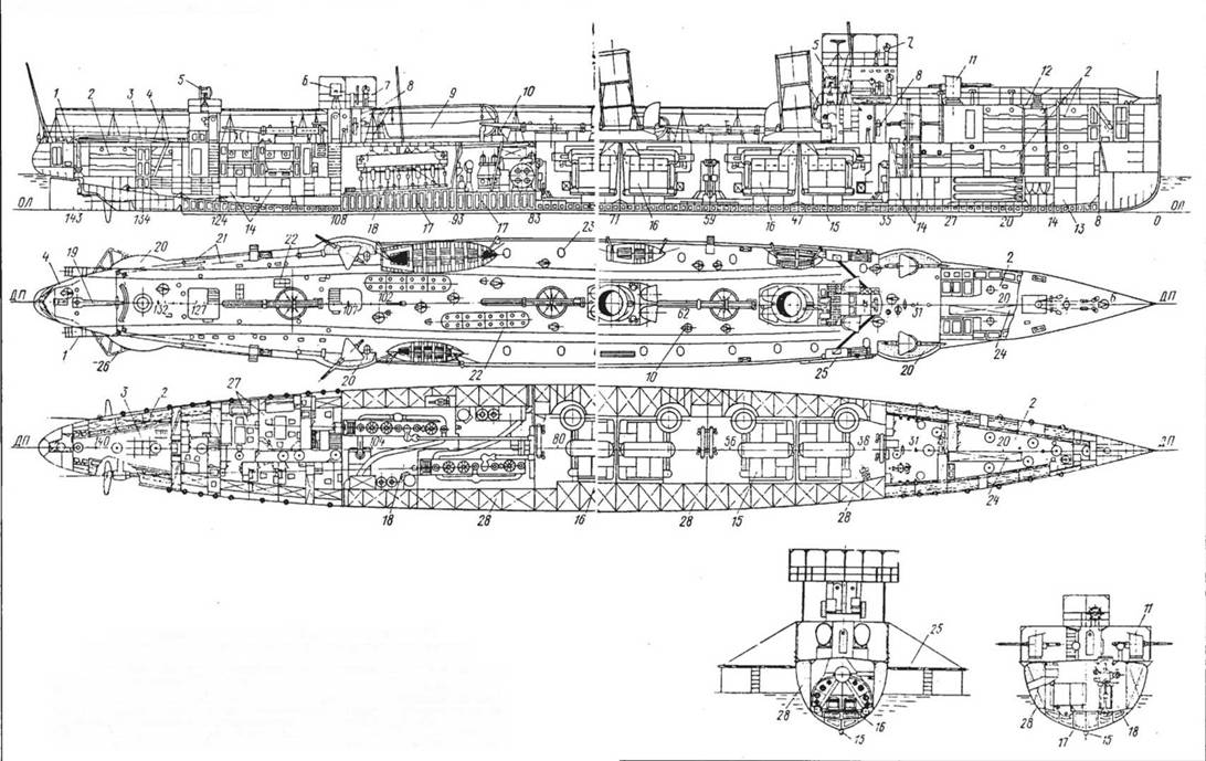 1– рельсовый путь и скат для сбрасывания мин заграждения, 2-кубрик, 3– фундамент и подкрепление под кормовое 120-мм орудие, 4– тентовое устройство, 5– прожектор. 6– пулемет, 7-компас. 8-рулевая машина, 9-гребной 10-весельный катер, 10-сходной люк, 11– 75-мм орудие, 12-подкрепление под шпиль, 13– цепной ящик, 14– погреб боезапаса, 15-наружный вертикальный киль, 16– котельное отделение, 17– фундаменты машинных отделений, 18– машинное отделение, 19-румпель, 20– спонсоны, 21-штуртросовая проводка по верхней палубе, 22-световой люк, 23– горловина для погрузки угля, 24-торпедопогрузочный люк, 25-выстрел, 26-отвод для защиты гребного винта, 27– офицерские каюты и кают-компания, 28-угольные ямы,