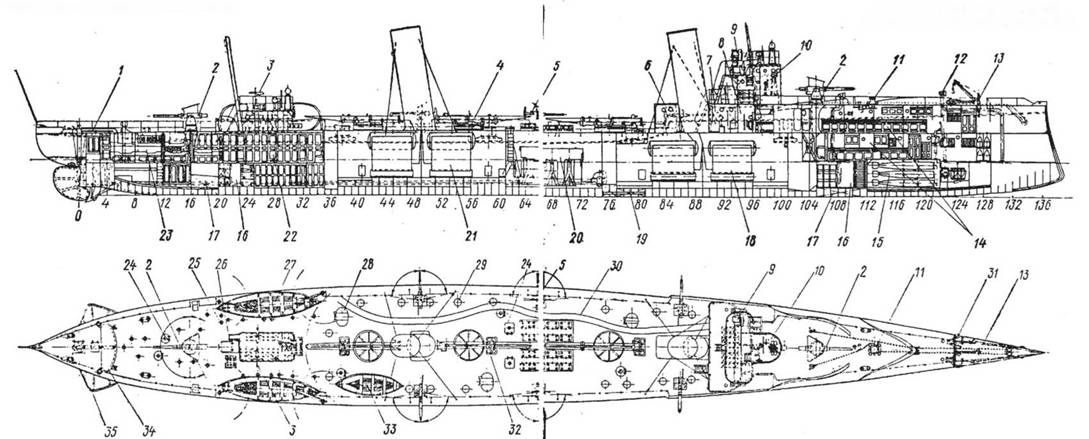 Ни в чем не отступая от прототипа, фирма сохранила и компоновку машинно-котельной установки с центральным (вовсе для проекта не оптимальным) расположением посреди корпуса попарно установленных главных машин. Котлы располагались в двух группах – одна позади, другая впереди машин. Такое расположение позволяло легко решать задачи проектной дифферентовки всех составляющих весовой нагрузки, но вовсе не было удобным для эксплуатации. Соответственно увеличилась длина линии гребного вала, протянувшейся почти на половину длины корпуса. Это требовало усилить их сечение и увеличить число опорных подшипников. Длинные гребные валы были более чувствительны к общему прогибу корпуса, осложнилось их обслуживание, увеличился риск повреждений при авариях корабля. Такое решение никогда более не повторялось. Но Особый комитет был. по– видимому, вполне доволен проектом, и в этом соглашательстве и готовности принять характеристики и решения прошлого века заключается главнейшая загадка нового заказа.