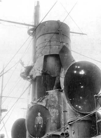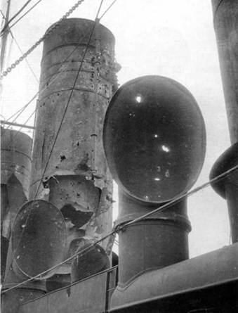 Не без повреждений обошлось это и для неприятеля: в начале боя, когда у нас еще был цел телеграф, мы приняли: "Русские не будут пропущены обратно" (а пришлось пропустить!) и затем: "Имею течь, прошу присылки еще двух судов".