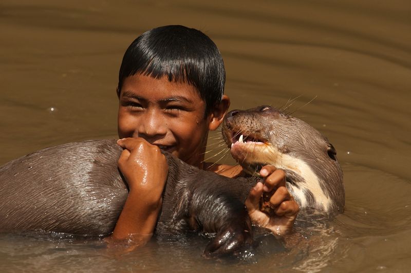 А вот перепончатыми лапами, плоским хвостом и большими усами они напоминали водных зверей семейства куньих. Эти существа были коллективными и всеядными, что помогало им в борьбе с наземными и водными хищниками. По внешнему виду я бы пожалуй сравнил их с огромными амазонскими выдрами, только покрытыми крупной костяной чешуёй, с козлиными рогами и гребнем. Амазонские выдры охотятся на всех, кто обитает в реке, даже тех, кто крупнее их в несколько раз, потому что охотятся коллективно, а против стаи может выстоять только другая стая, при этом они не трогают только млекопитающих, считая их своими, а вот крокодилов, анаконд, гигантских сомов они хряпают за обе щёки. Индейцы называют амазонских выдр "речными волками". При этом рядом с человеком они ведут себя как кошечки или собачки, легко выполняя разные команды и выпрашивая корм (при это они сверчат словно соловьи). И если земные выдры легко становятся домашними животными людей, то для разумных луней уже люди – домашние животные.