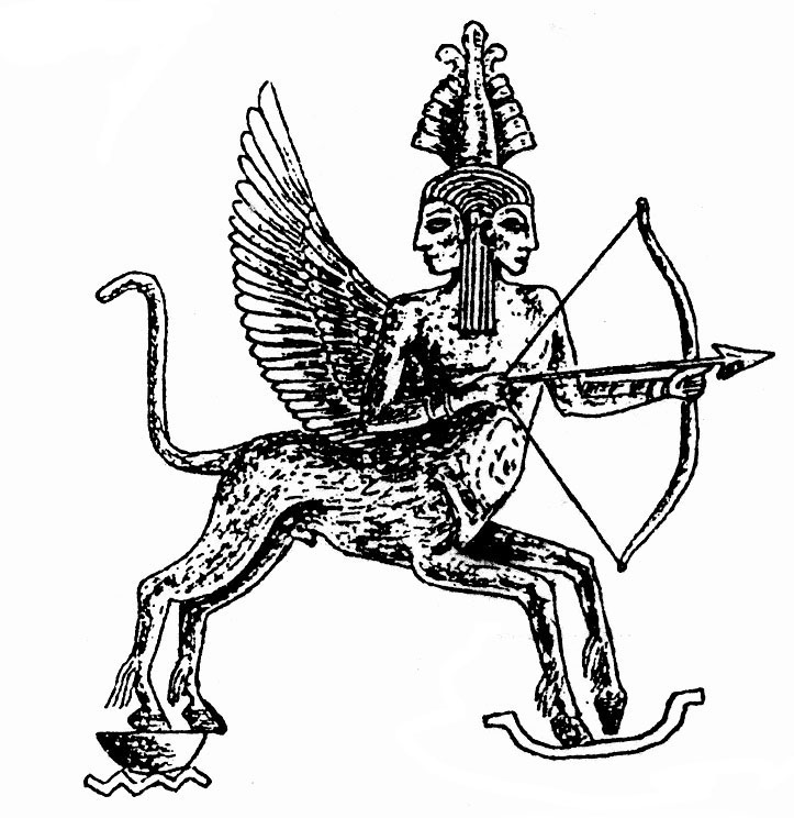 Занятно, что у древних египтян и вавилонян Стрелец, это не просто лучник, а именно кентавр, да ещё и с крыльями, и двумя головами. Причём тело мало похоже на конское, скорее на какого то оленя, а вавилоняне ещё подрисовывали этому существу огромный эрогированный член (возможно как символ плодородия). А вообще в вавилонской мифологии Стрелец отвечает за то, чтобы направлять души умерших на небеса.