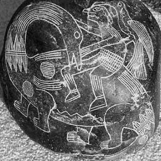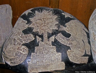 Но на мой взгляд самые интересные камни те, где эти великаны разговаривают со своим Богом. Он похож на Солнце с человеческим лицом (так же рисовали бога славяне на своих щитах), находящимся на вершине пирамиды. Это такой Бог (тувалу) с которым можно пообщаться, а не просто помолиться на стену с его изображением или в сторону Мекки. Кстати сравните изображение на этом камне с изображением на долларе...