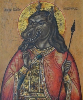 Что вы знаете о святом Христофоре? В годы правления императора Деция Траяна, человек, носивший имя Репрев был захвачен в плен римлянами во время боя в Мармарике (восточная Киренаика). Позже он служил в римском подразделении мармаритов (берберов из области Мармарика) потому что знал их язык. Это был человек огромного роста и ужасающего поведения, он был волкоглавцем. Внезапно для императора Репрев оказался ещё и христианином, а в Риме тогда шла борьба с христианством. Ради прикола император поселил Репрева в публичном доме с проститутками. И тот в короткое время с помощью своего бакулюса и гипноза всех их сделал добрыми христианками. Дальнейшая его судьба неизвестна. Но одно точно – он погиб, потому что умершие своей смертью, святыми у христиан обычно не становятся. Что интересно в Риме его не почитали. Великую славу святой Христофор обрёл в Египте (среди христианского народа коптов) и в России, где во многих церквях лежали мощи святого Христофора – черепа волколюдей ликан, правда они были местного происхождения.