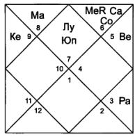 Навамша Д9. Конечно, точное время не известно (тогда мы просто смотрим положение планет в знаках), но тем не менее: в 1-м доме Венера и Раху в Деве, во 2-м доме Луна, в 6-м доме Солнце, в 7-м доме Кету и Юпитер, в 10-м доме Марс, в 12-м Меркурий.