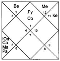 Восходящий Овен. Юпитер, Сатурн, Марс и Раху в 5 доме. Солнце в первом доме в экзальтации с Ауной. Венера во втором, Меркурий в 12 доме, Кету 11.