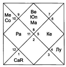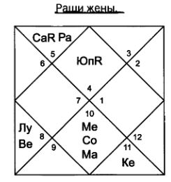 Раши: восходящая Дева, во 2-м доме Луна, в 4-м – ретроградный Сатурн, в 6-м – Марс и Раху, в 9-м – Юпитер, Меркурий, ретроградная Венера, в 10-м– Солнце, в 12-м – Кету.