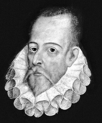 «В биографиях автора знаменитого романа „Хитроумный идальго Дон Кихот Ламанчский“ Мигеля де Сервантеса говорится, что учился он урывками, а потом, не найдя средств к существованию в Испании, отправился в Италию, где определился на службу к кардиналу Аквавиве.